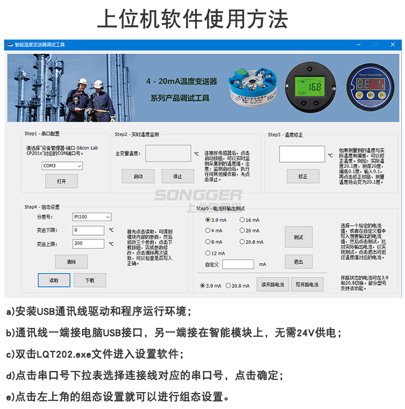 该温度变送器可直接安装在热电偶、热电阻的接线盒内与之形成一体化结构。它作为新一代测温仪表可广泛应用与冶金、石油、化工、电力、轻工、纺织、食品、国防以及科研等工业部门