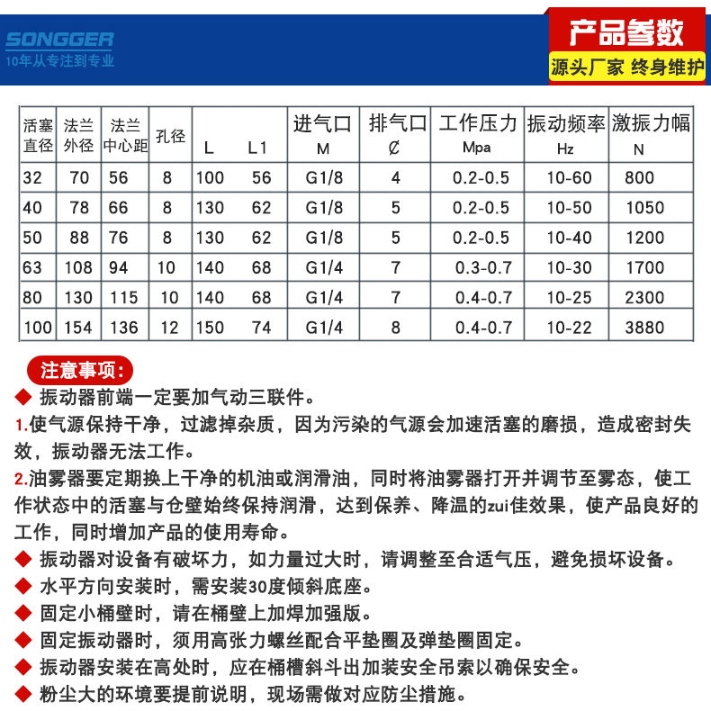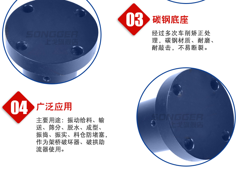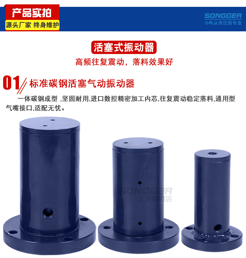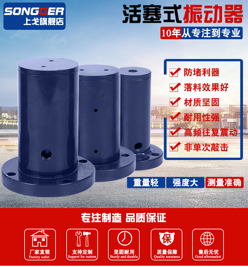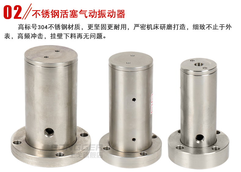 气动活塞振动器,利用空气压缩机排出的高压气体通过气管接入产品进气口,当气体推动活塞上行,活塞上气室内气体受到挤压,受挤压的气体通过排气孔排出。当活塞上行至终点时,气体通过槽和气道自动切换通气方向,使气体进入活塞上气室。应用于食品、医药、化工、农药、饲料、陶瓷、玻璃、水泥、燃料等粉体加工行业中。