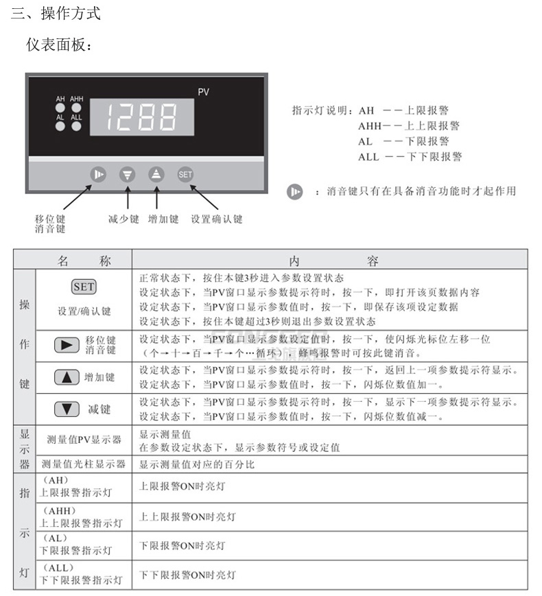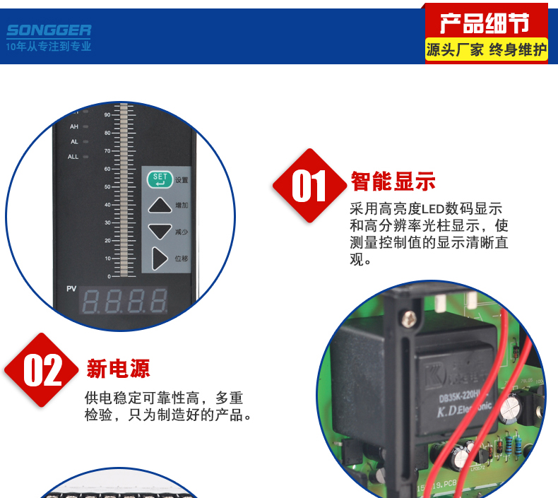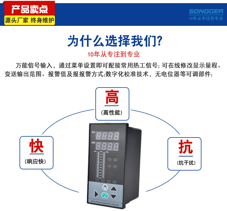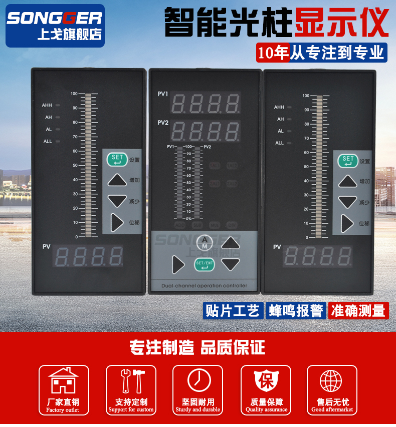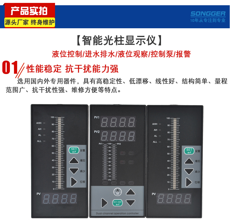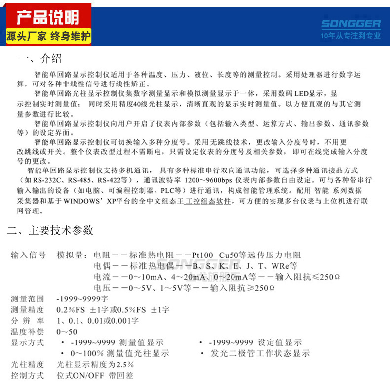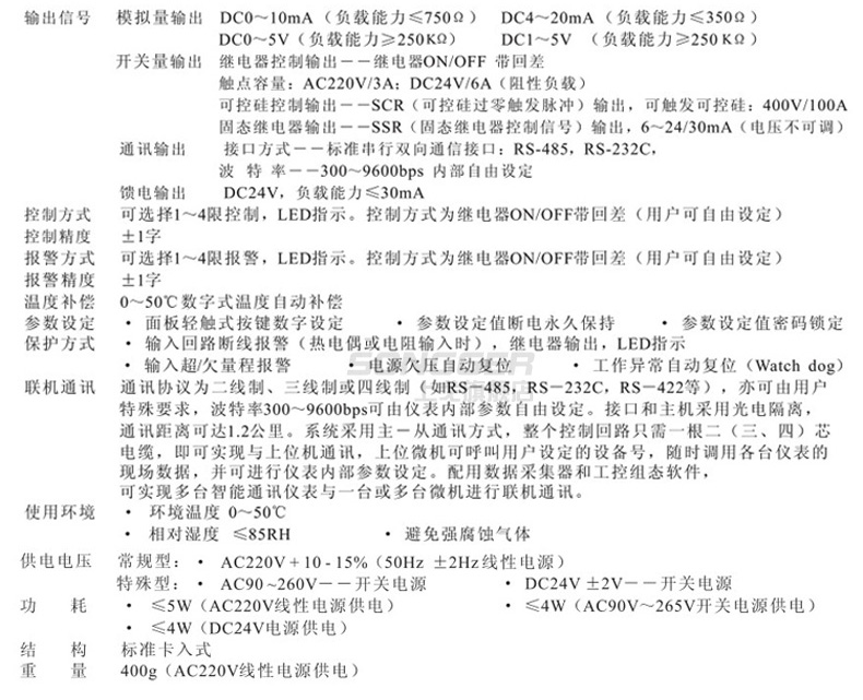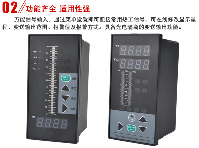智能数字/光柱显示控制仪,采用先进的微处理器进行智能控制,适用于温度、湿度、压力、液位、瞬时流量、速度等多种物理量检测信号的显示及控制,并能对各种非线性输入信号进行高精度的线性校正。